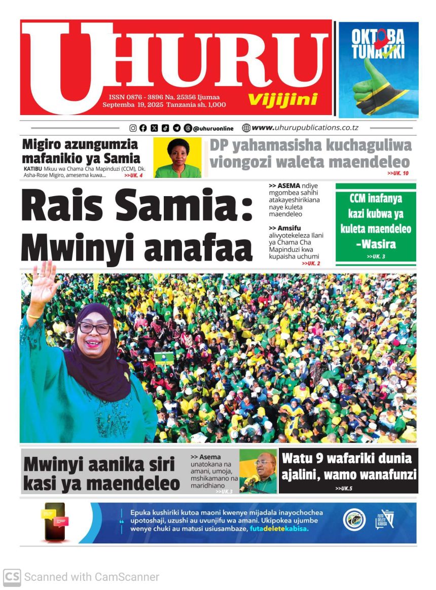 19/09/2025 0 Comment 26 Views HABARI KUBWA KATIKA MAGAZETI YA LEO SEPTEMBA I9, 2025 by Suzzy Mathias GST NA BGS YA UINGEREZA ZASAINI HATI YA MAKUBALIANO UTAFITI WA MADINI DKT. ADESINA AMALIZA ZIARA YA SIKU NNE NCHINI TANZANIA SHARE Michezo Burudani