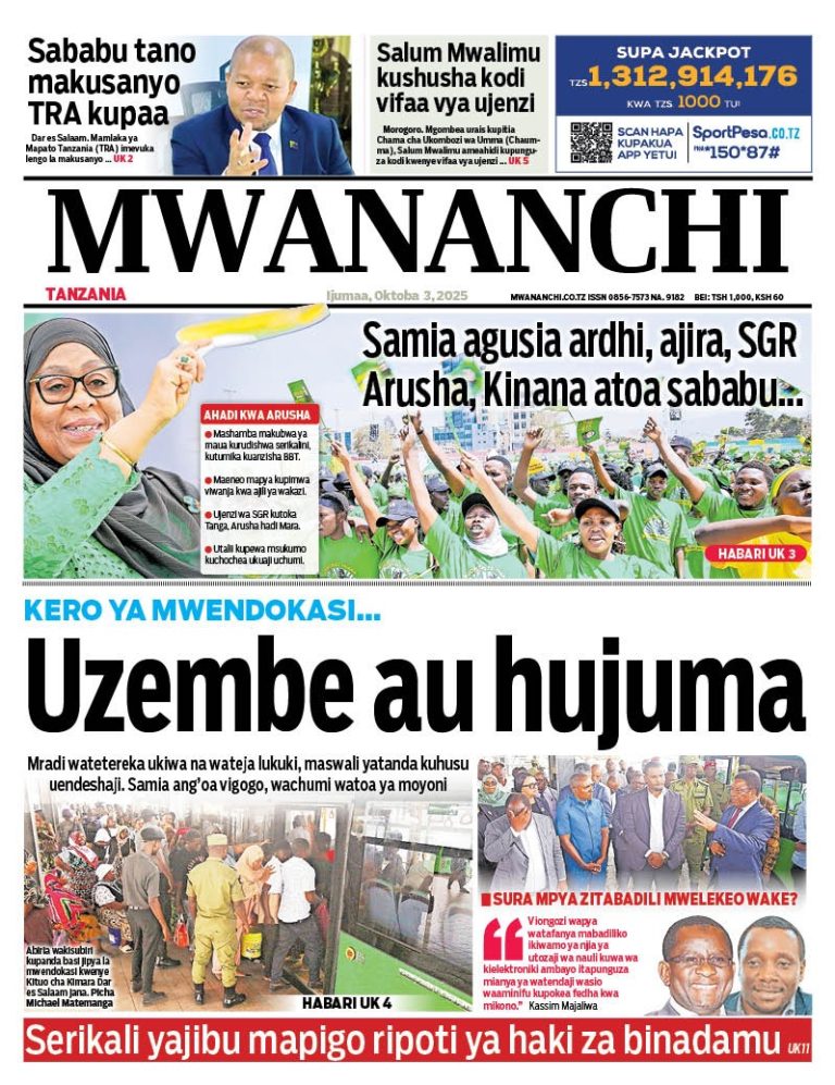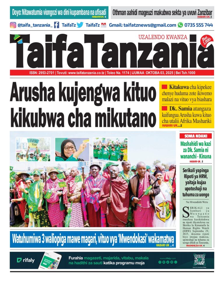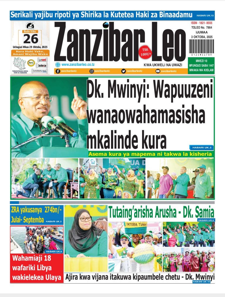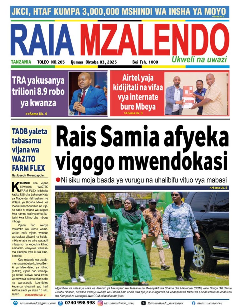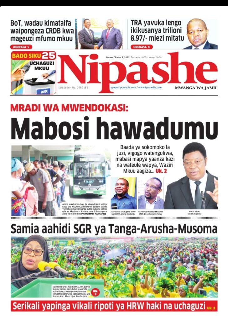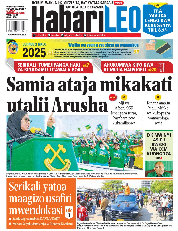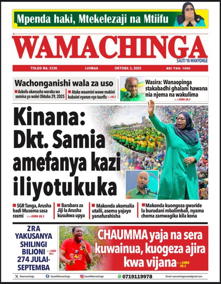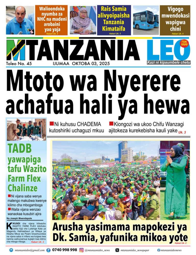 03/10/2025 0 Comment 1 Views HAYA HAPA MAGAZETI YA LEO OKTOBA 3, 2025 by Suzzy Mathias KAMATI YA UKAGUZI TARURA YATEMBELEA MIRADI MINNE YA BARABARA SHINYANGA Uchaguzi 2025: TAMWA Yataka Ulinzi wa Haki za Wagombea Wanawake SHARE Michezo Burudani