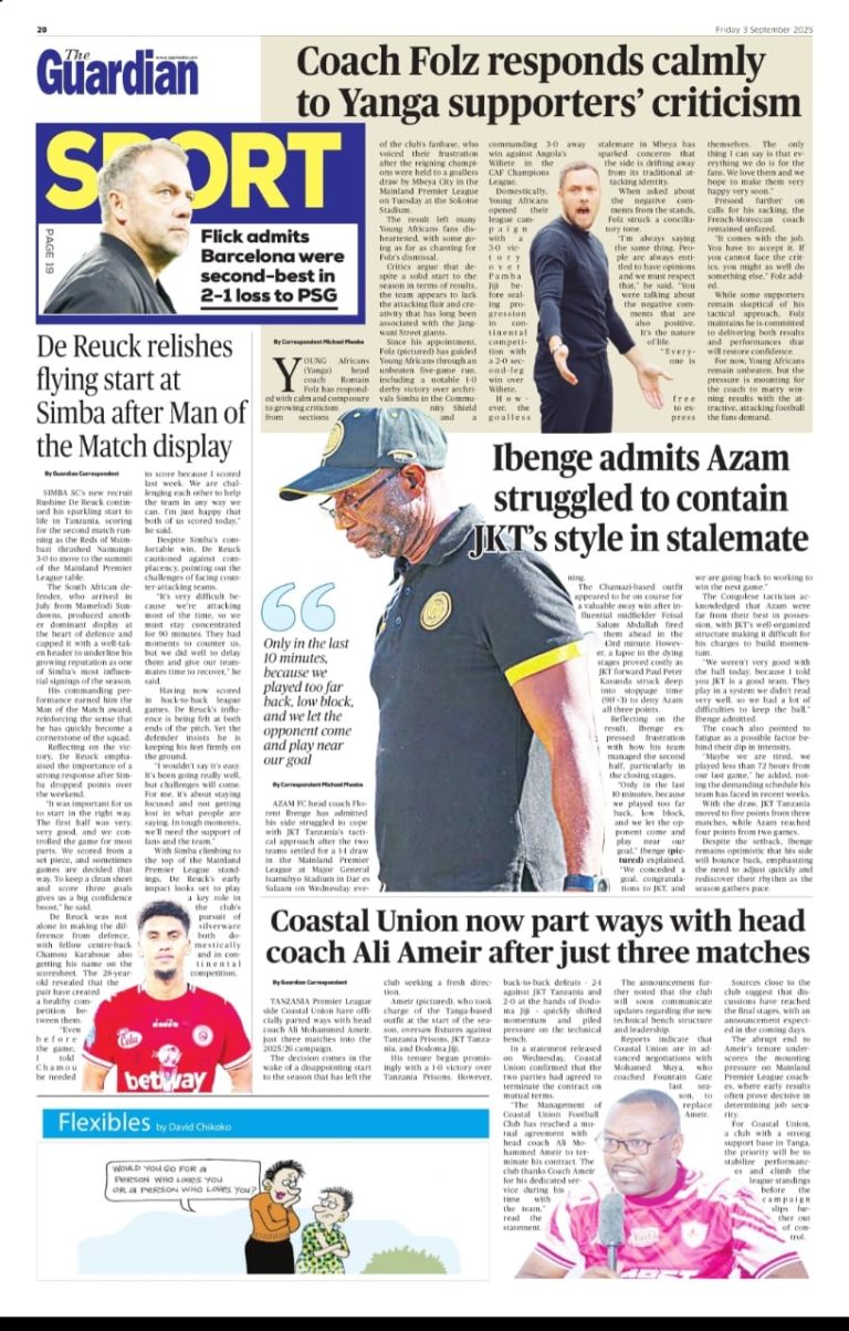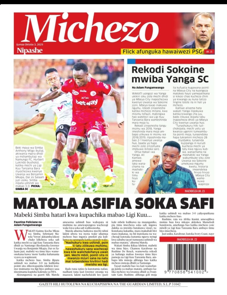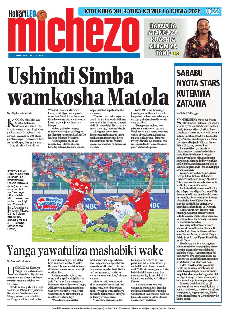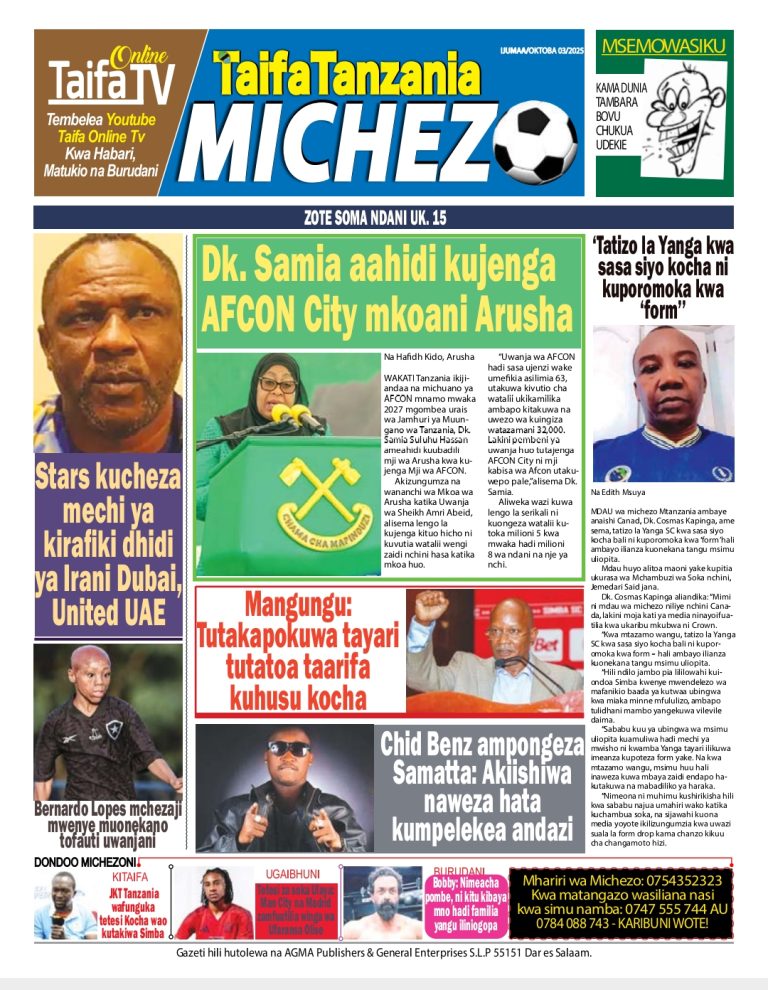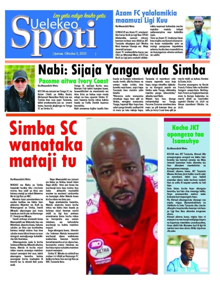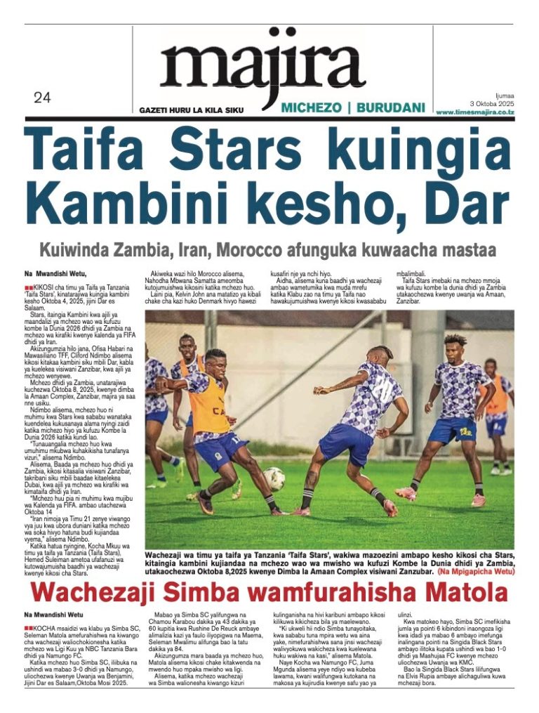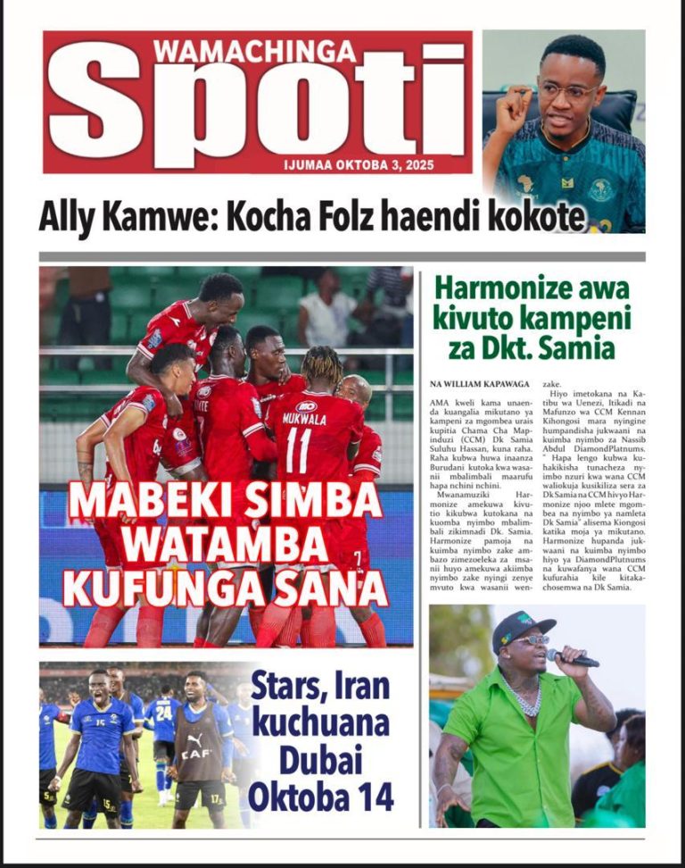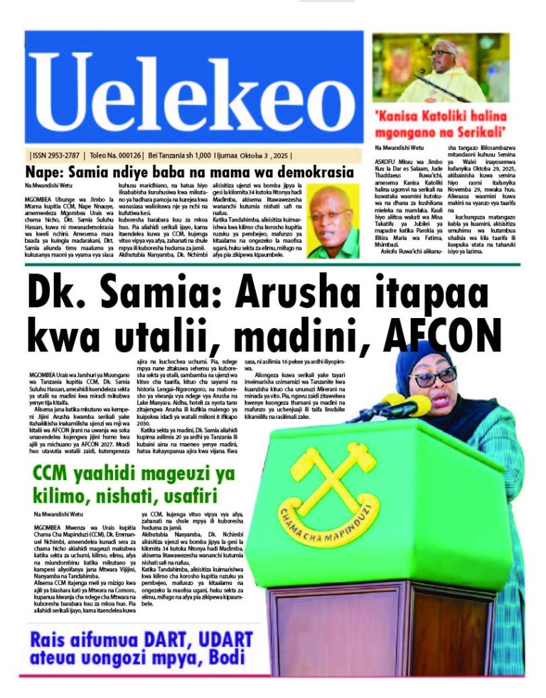 03/10/2025 0 Comment 1 Views HAYA HAPA MAGAZETI YA LEO OKTOBA 3, 2025 by Suzzy Mathias KAMATI YA UKAGUZI TARURA YATEMBELEA MIRADI MINNE YA BARABARA SHINYANGA Uchaguzi 2025: TAMWA Yataka Ulinzi wa Haki za Wagombea Wanawake SHARE Michezo Burudani