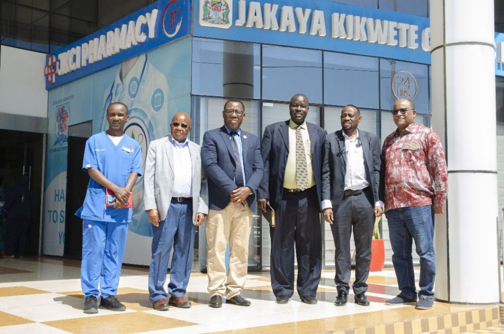 Mkurugenzi Mtendaji wa Taasisi ya Moyo Jakaya Kikwete (JKCI) Dkt. Peter Kisenge, Mkurugenzi wa Huduma za tiba kutoka Umoja wa Afrika Dkt. Adamu Isah, Mkurugenzi wa Kurugenzi ya Uuguzi wa Taasisi ya Moyo Jakaya Kikwete (JKCI) Robert Malya na wafanyakazi wa Umoja wa Afrika (AU) wakiwa katika picha ya pamoja wakati wa ziara ya kutathimini huduma za matibabu ya moyo zinazotolewa na taasisi hiyo.