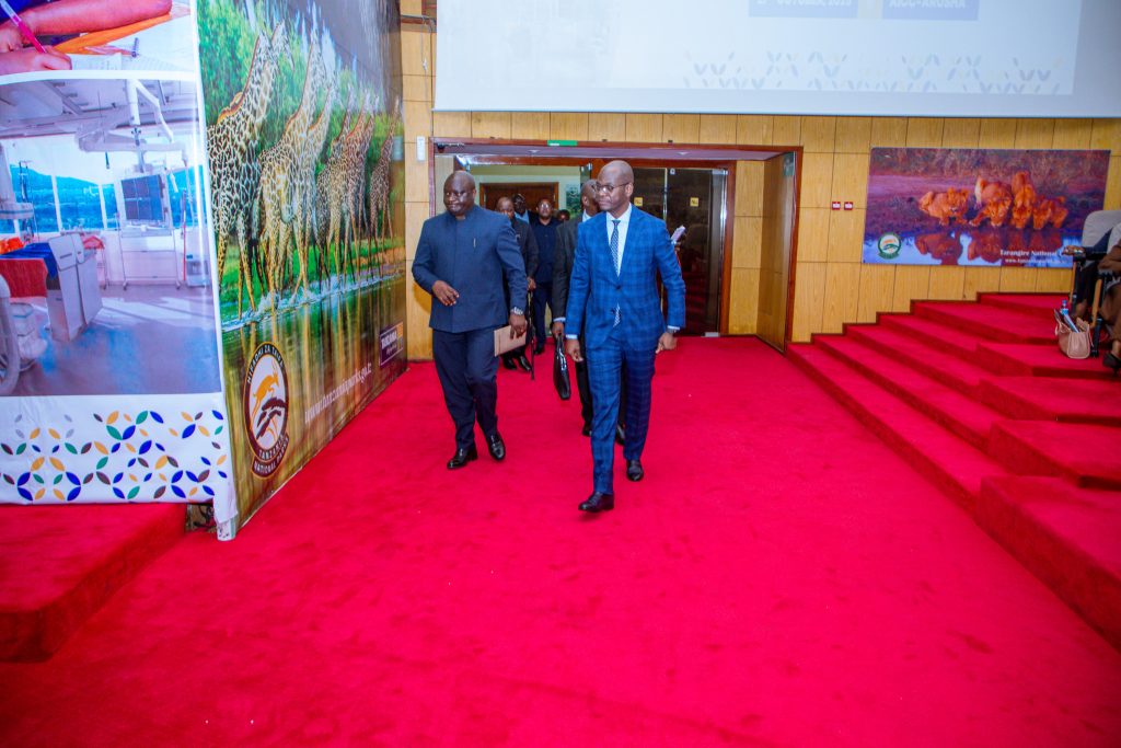 Kamishna wa Idara ya Usimamizi wa Bajeti, Wizara ya Fedha Bw. Meshack Anyingisye (kulia), Katibu Tawala Msaidizi wa Mkoa wa Arusha, Bw. Moses Tesha, wakiwasili katika ukumbi wa Simba, Kituo cha Mikutano cha Kimataifa cha Arusha (AICC) mkoani Arusha, kushiriki Kikao kazi cha Mapitio ya Matumizi ya Fedha za Umma, (Public Expenditure Review -PER) ngazi ya sekta.
