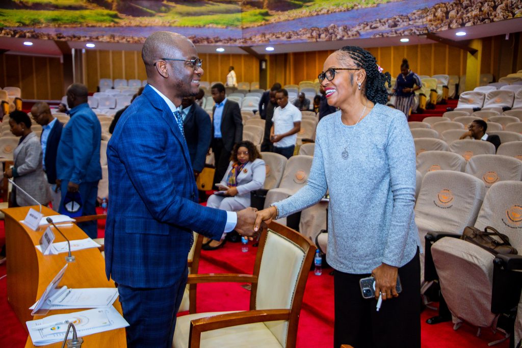 Kamishna wa Idara ya Usimamizi wa Bajeti, Wizara ya Fedha Bw. Meshack Anyingisye (kushoto), akisalimiana na Mkurugenzi Msaidizi wa Mipango na Bajeti, Ofisi ya Rais Menejimenti ya Utumishi wa Umma na Utawala Bora, Bi. Julieth Magambo, wakati wa Kikao kazi cha Mapitio ya Matumizi ya Fedha za Umma, (Public Expenditure Review -PER) ngazi ya sekta, Kituo cha Mikutano cha Kimataifa cha Arusha (AICC) mkoani Arusha