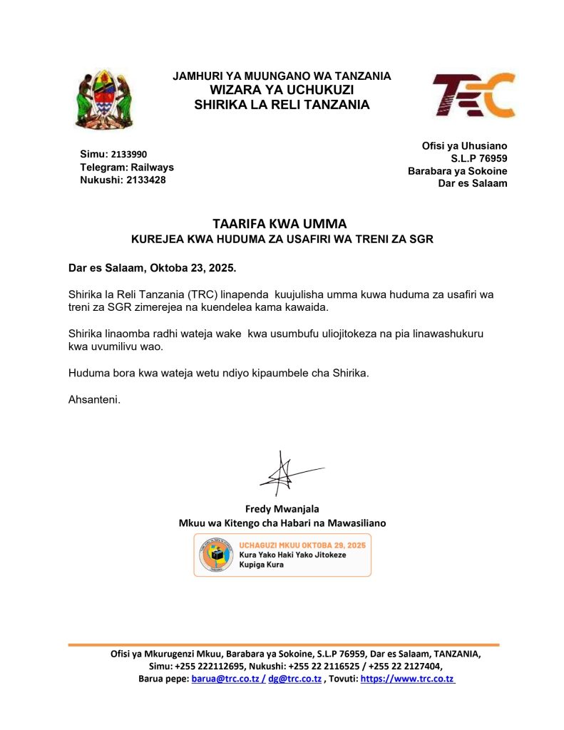 23/10/2025 0 Comment 1 Views HUDUMA ZA USAFIRI WA TREIN YA SGR YAREJEA by 4dmin Mutungi: Viongozi wa Vyama wawe Walimu kwa Wagombea Uchaguzi Waziri Mkuu Kassim Majaliwa Azindua NBC Kiganjani, Ahimiza Taasisi Za Fedha Kuoanisha Mifumo SHARE Matukio Habari