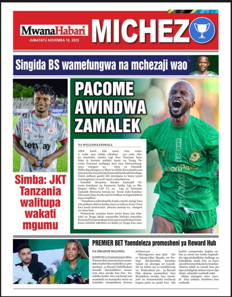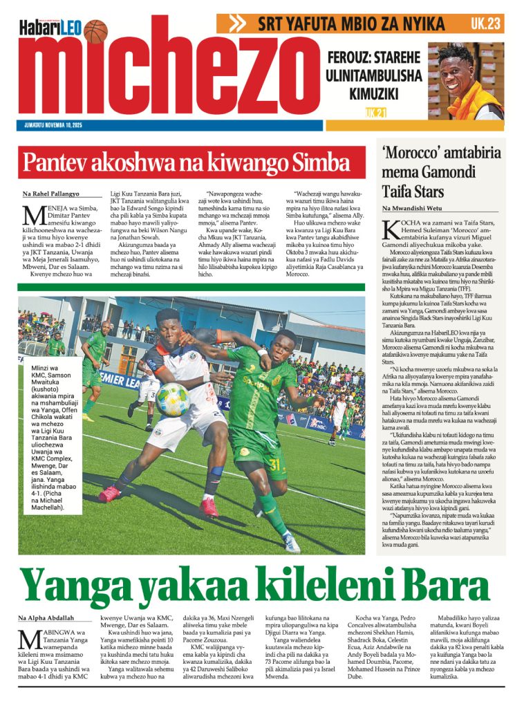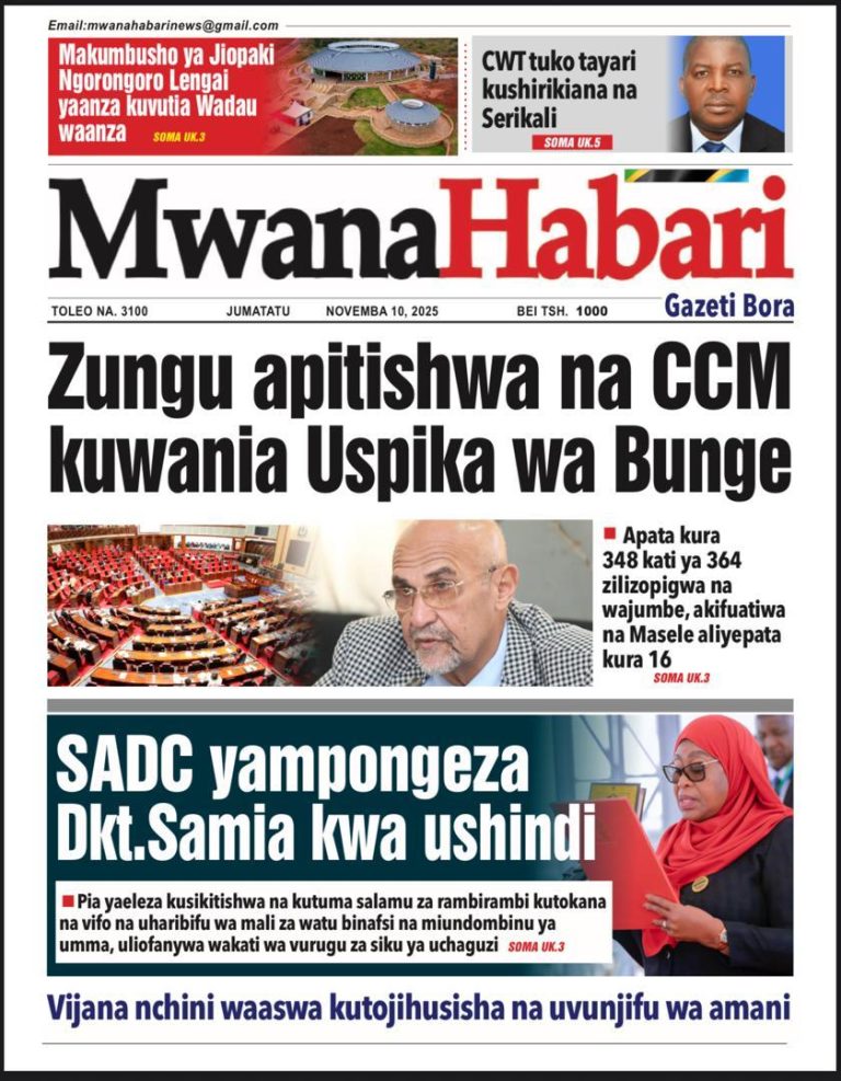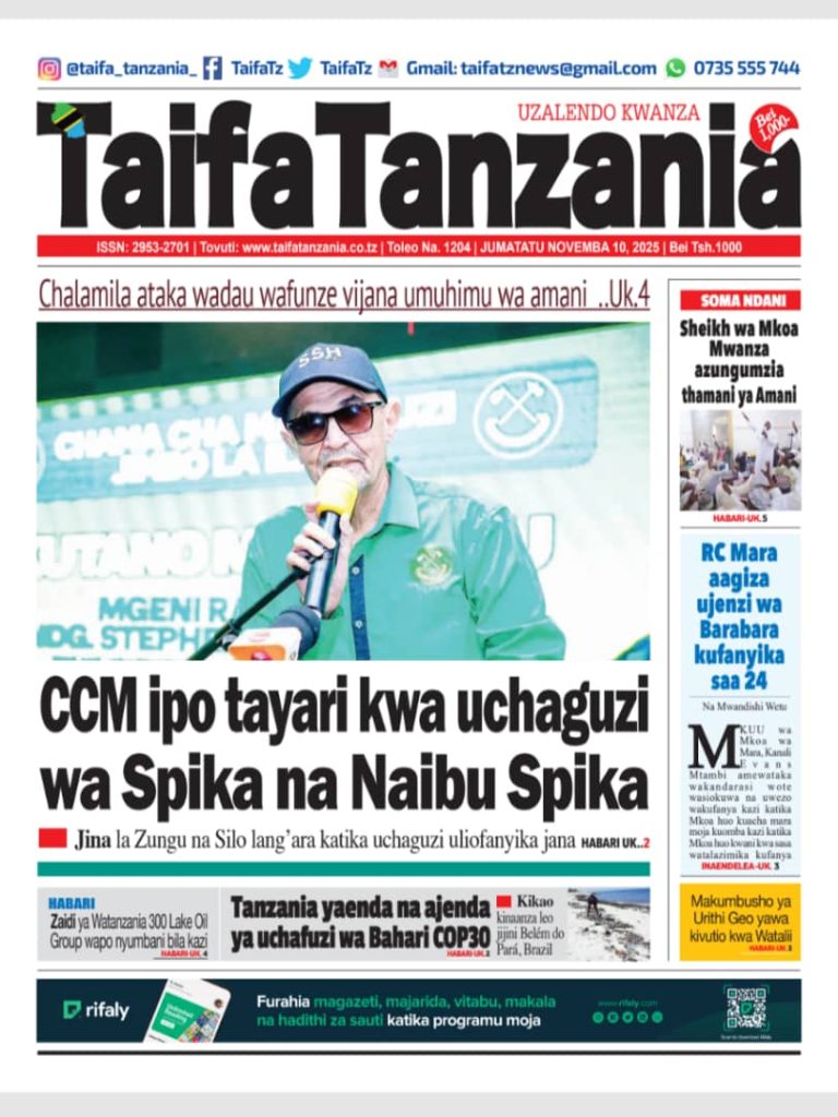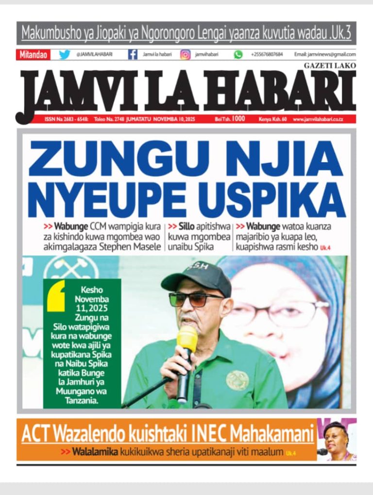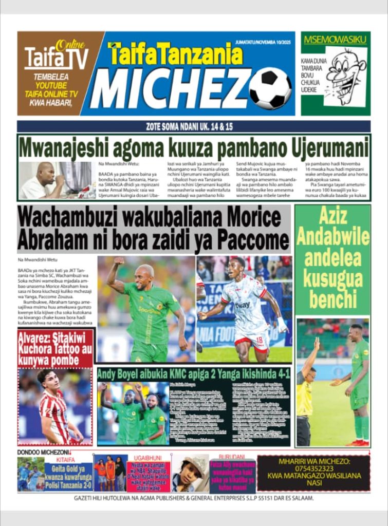 10/11/2025 0 Comment 0 Views HAYA HAPA MAGAZETI YA LEO NOVEMBA 10, 2025 by Suzzy Mathias United yamtisha Maresca TIC YAADHIMISHA KUMBUKIZI YA MWALIMU NYERERE KWA KUSHIRIKI UPANDAJI MITI JIJINI ARUSHA SHARE Michezo Burudani