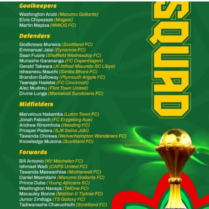 WASHAMBULIAJI: Bill Antonio (KV Mechelen FC), Ishmael Wadi (CAPS United FC), Tawanda Maswanhise (Motherwell FC), Daniel Msendami (Marumo Gallants FC), Prince Dube (Young Africans SC), Washington Navaya (TelOne FC), Macauley Bonne (Maldon & Tiptree FC), Junior Zindoga (TS Galaxy FC) na Tadiwanashe Chakuchichi (Scotland FC).